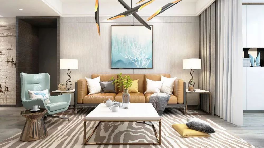 裝飾畫有藍(lán)色抱枕采用同樣的藍(lán)色;裝飾畫有橙色,抱枕和茶幾也利用橙色保持一致;地毯呢則可以和裝飾一致了。
