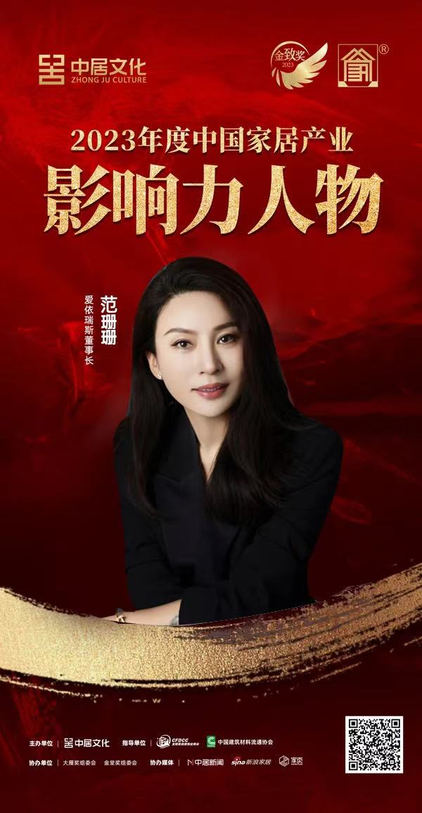 2023年,在華北會(huì)場(chǎng)的頒獎(jiǎng)盛典上,愛(ài)依瑞斯董事長(zhǎng)范珊珊榮膺本次度中國(guó)家居產(chǎn)業(yè)影響力人物。