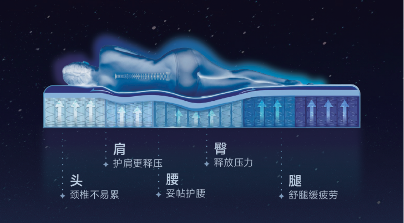 除了睡眠微環(huán)境調(diào)控,阿波羅床墊在支撐、釋壓與身體放松層面也形成了較完整的產(chǎn)品邏輯。其一方面通過更平衡的軟硬配比與分區(qū)承托,幫助脊柱在不同睡姿下更接近自然生理曲度,減輕局部受壓與肌肉持續(xù)做功;另一方面,通過更穩(wěn)定的人床界面狀態(tài),減少無效翻身與碎片化睡眠。