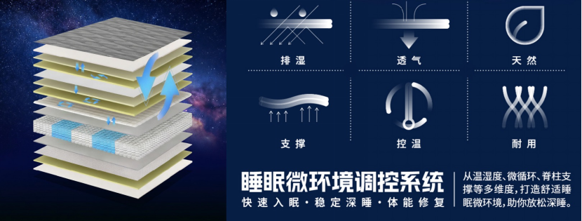圍繞這些問題,該系統(tǒng)通過“透氣—導(dǎo)熱—濕度緩沖/隔離”的協(xié)同設(shè)計(jì),幫助人床接觸界面更快建立起相對(duì)干爽、舒適、穩(wěn)定的狀態(tài),讓身體更容易進(jìn)入放松節(jié)奏,也讓整晚睡眠更少被環(huán)境打擾。